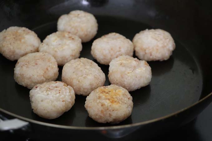 - 3.フライパンに油を入れ熱し、おにぎりを並べ中火で表面を焼き取り出す。