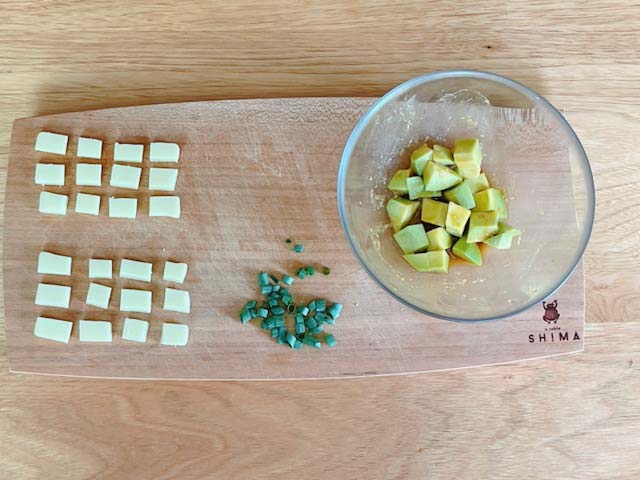 アボカドは皮を剥き1㎝角切りにし、醤油とわさびで和えておく。