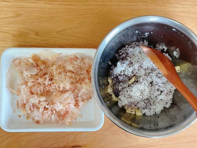 - 3.ひとつのボウルにゆかり、チーズの半量を入れ優しく混ぜる。とろける本枯節3gも加え混ぜる。