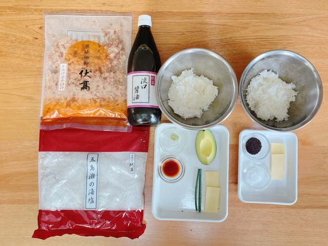 - 5.手に軽く水と塩を馴染ませる。それぞれ2個になるようおにぎりを握る。