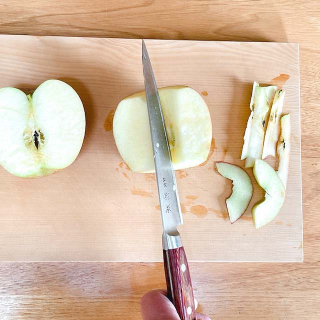 - 1.林檎は縦2等分。天地を薄く切り落とし芯を除く。