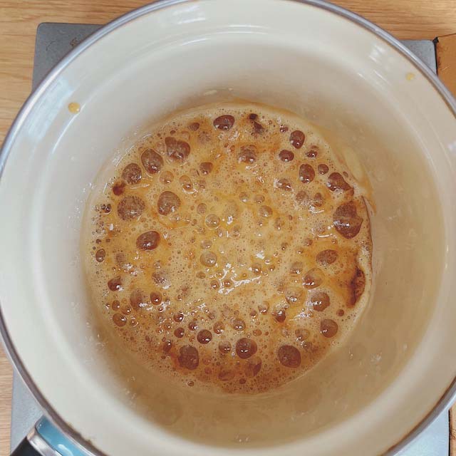 - 3.林檎が焼けたら小鍋に糀みつを入れ中火で焦がさないように混ぜながら煮詰める。