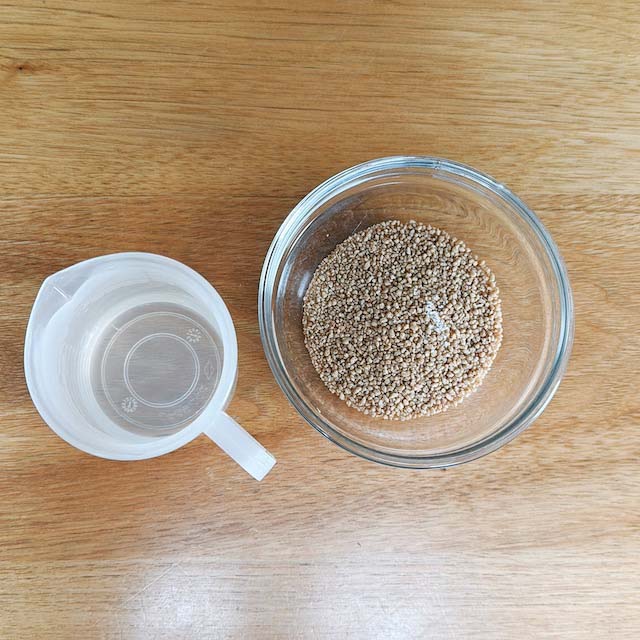- 1.クスクスと塩少々(分量外)は耐熱容器に入れる。熱湯を注ぎ全体にお湯が回るように混ぜる。ラップをして10分置く。