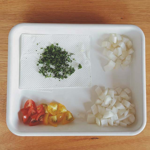 - 3.新玉ねぎ、ミニトマトは1㎝角切り。