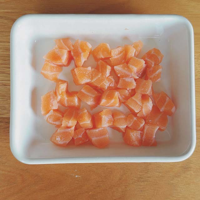 - 5.サーモンは1㎝角切りにし塩少々(分量外)をまぶしておく。