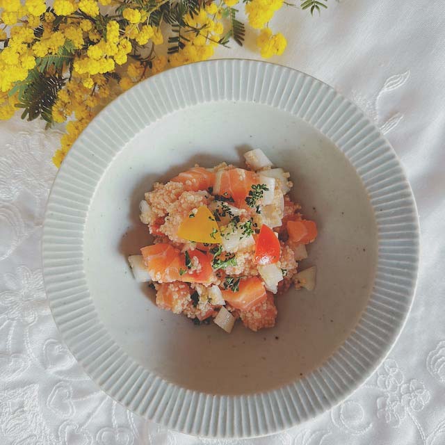 - 7.6に戻したクスクス、サーモン、水気を除いたうど、新玉ねぎを入れ味を吸わせるように混ぜる。