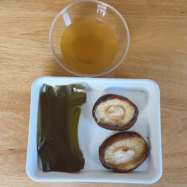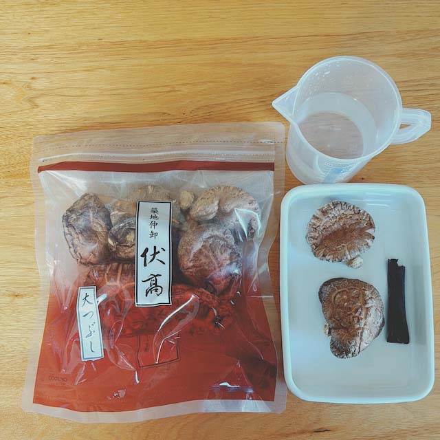 戻す時に昆布も一緒に入れて戻す事で異なる旨味同士が相乗効果で美味しくなります。