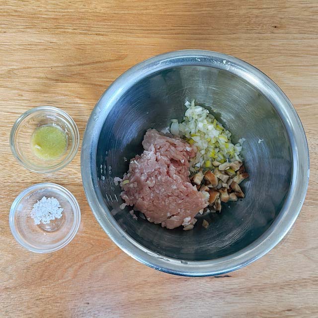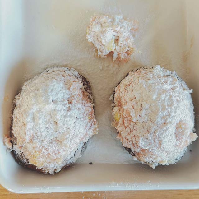 - 4.3の肉だねを大つぶしの傘側にこんもりと盛り上がるように詰める。