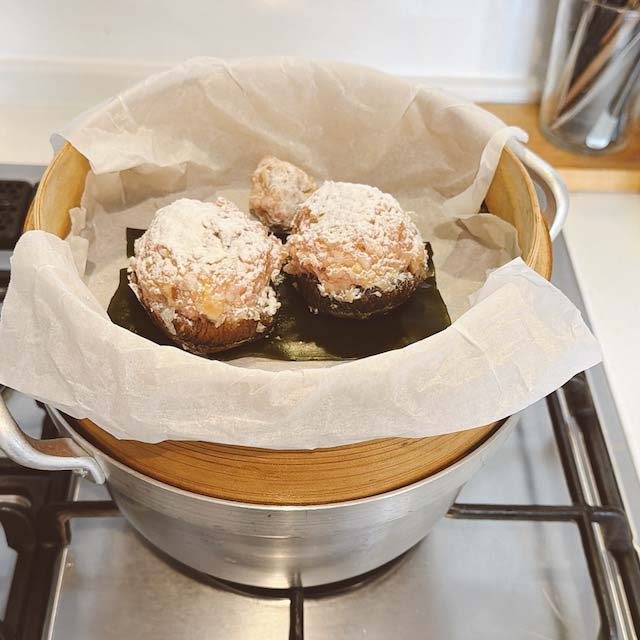 加熱は蒸すと椎茸も肉もかたくなりません。