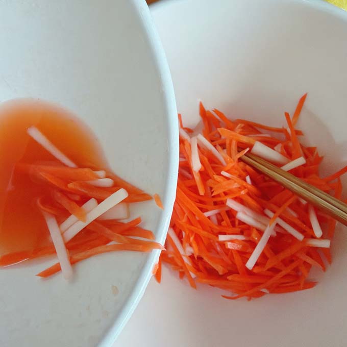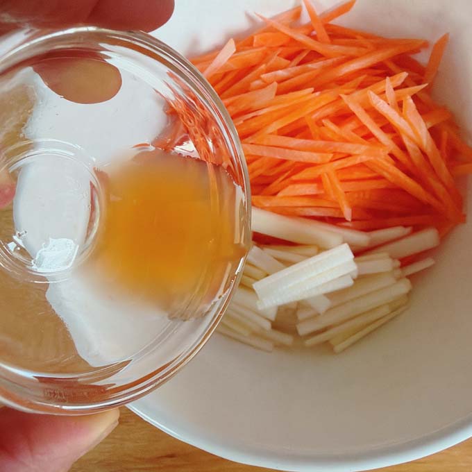 人参とうどをボウルに入れ下味用の梅酢を絡め10分程度室温におき出てきた水分を捨てる。