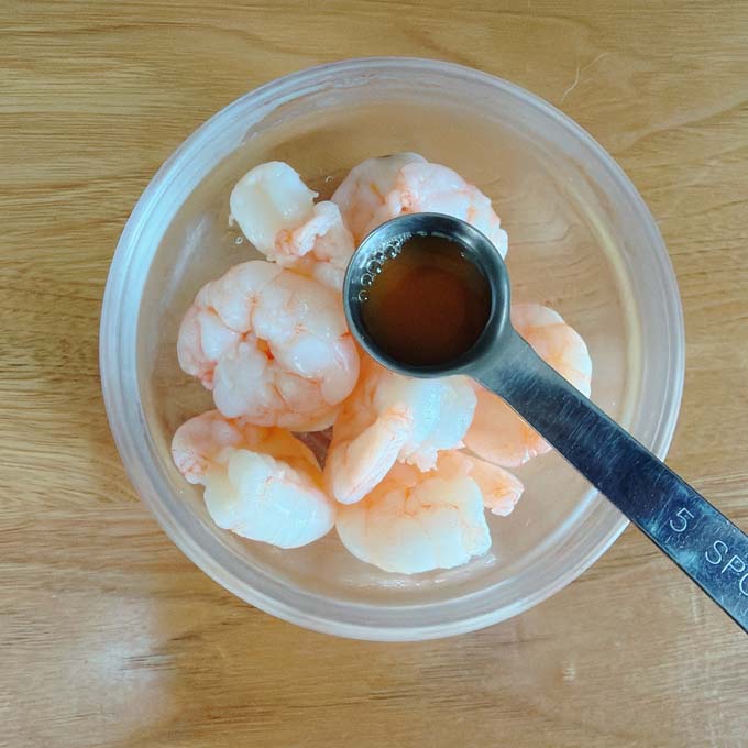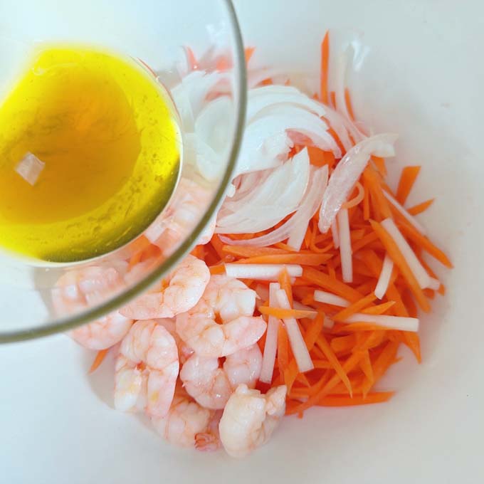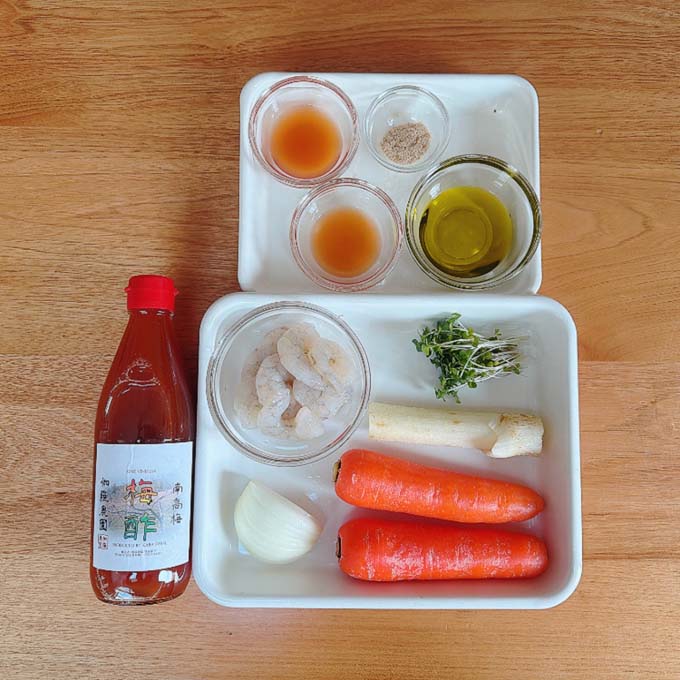 - 2.むき海老は水洗いし熱湯で茹でる。熱いうちに梅酢(分量外)小さじ1/2を絡める。
