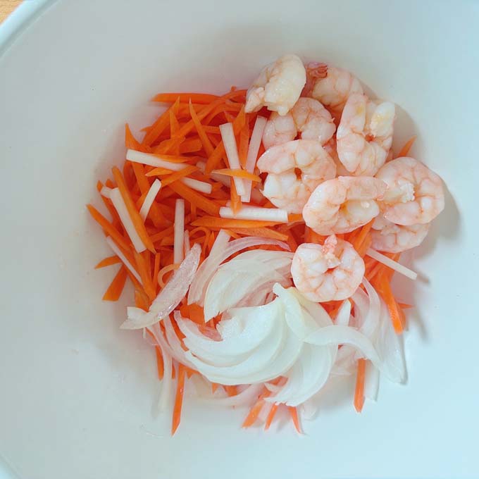 - 3.人参とうどに新玉ねぎと海老を加える。