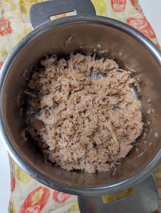 出し殻がもったいないので、火にかけサラダ油と塩コショウで味付けしたら、ツナ缶に近い味に。