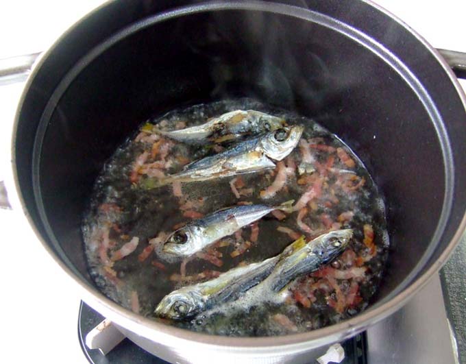 鍋にベーコンと鯵の煮干を入れて火にかけ炒める。 |
