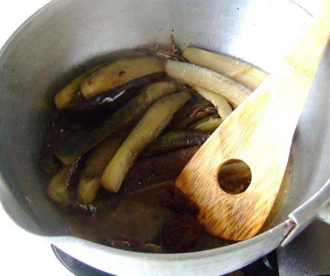 火加減は強めの中火くらいです、水が減ってくるとなすの煮え具合にムラができやすくなります、時々なすを動かして全体が均等に煮えるようにしてください。 |