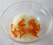 ボウルに水気を絞った大根、干し杏を入れ、4のだいだい酢を加えて味をなじませる。 |