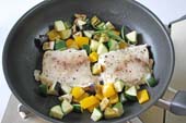 フライパンにオリーブオイルを熱し、めかじき、サイコロに切った野菜、ローズマリーをいれソテーする。 |