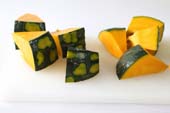 かぼちゃは種を取り、4X5.5cm位の食べやすい大きさに切る。 皮目を包丁でところどころそぎ、味をしみやすくする。 |