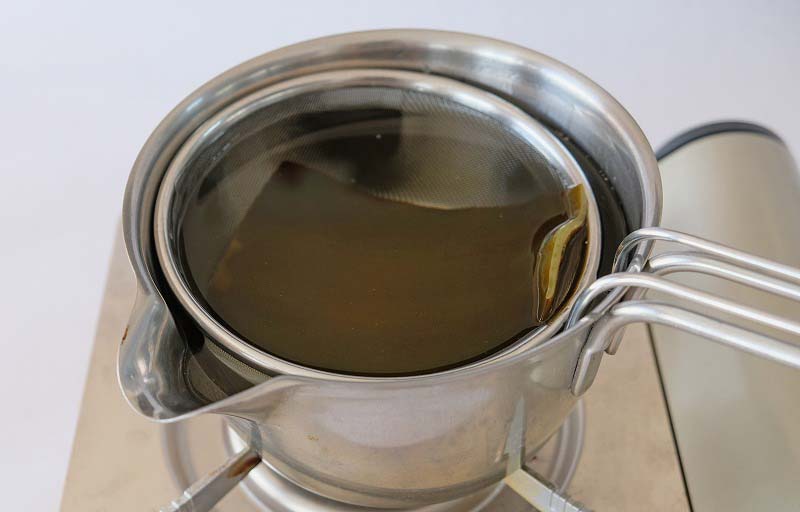 沸騰したら弱火にして5分程煮出し、火を止めてから薄削り節を加え、 一呼吸おいてザルを引き上げ、最後に箸でしっかり絞る。 |
