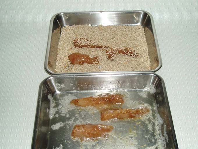 よくといだ卵白にササミをくぐらせ、ごまをまぶす。