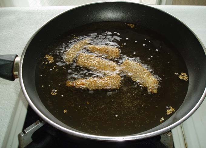 フライパンにササミがかぶる量の油を入れ、170度に熱し、4のササミを揚げる。 ささみはすぐに揚がります。揚げすぎるとパサつきますので注意しましょう。 |